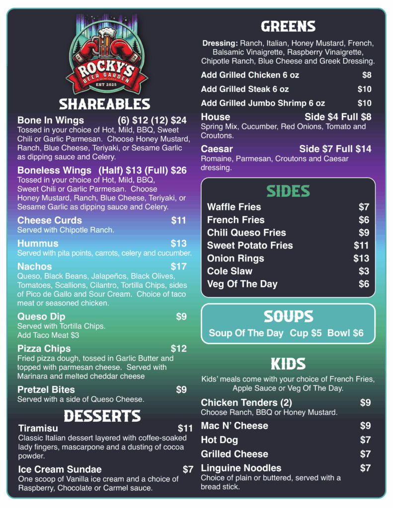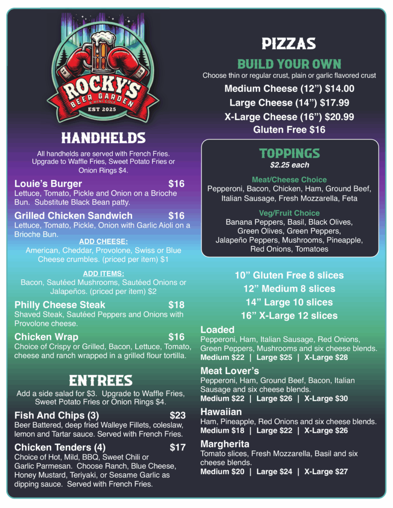 Rocky’s Beer Garden & Mini Golf brings Harbor Springs a brand-new outdoor experience. Enjoy great food and drinks, sit back and relax by the fire pits, catch the game on our outdoor TV’s, or take in some live music, and play the area’s only outdoor mini-golf course.